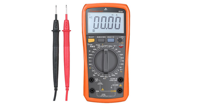 The E101 6000-count True RMS digital multimeter is designed with a large LCD display. The maximum measurable capacitance is 100mF, with fast response time of less than 12s. The NCV and continuity test modes is equipped with audio and visual feedback. In addition, this product has a LIVE function which is used for distinguishing between live and neutral wires. Also the E101 model is designed with automatic fuse blown detection and high voltage protection.